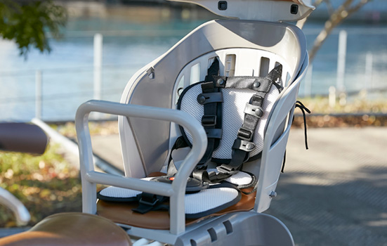 5点式シートベルト - 肩•腰•股で固定しているので、走行しているうちにズリ落ちることが無く安心。お子様がうとうとして寝てしまった時でも、安心して走行できます。